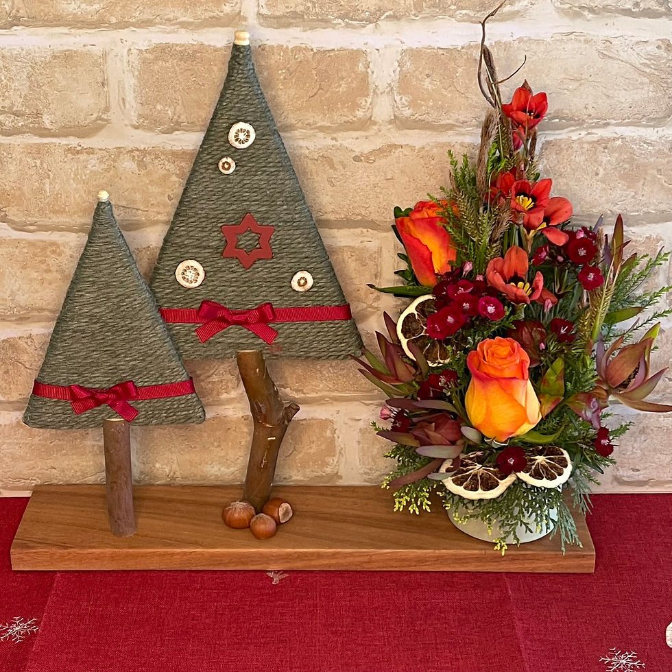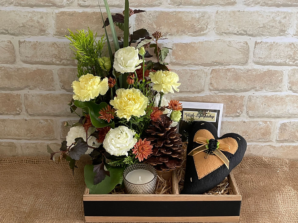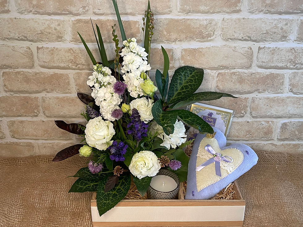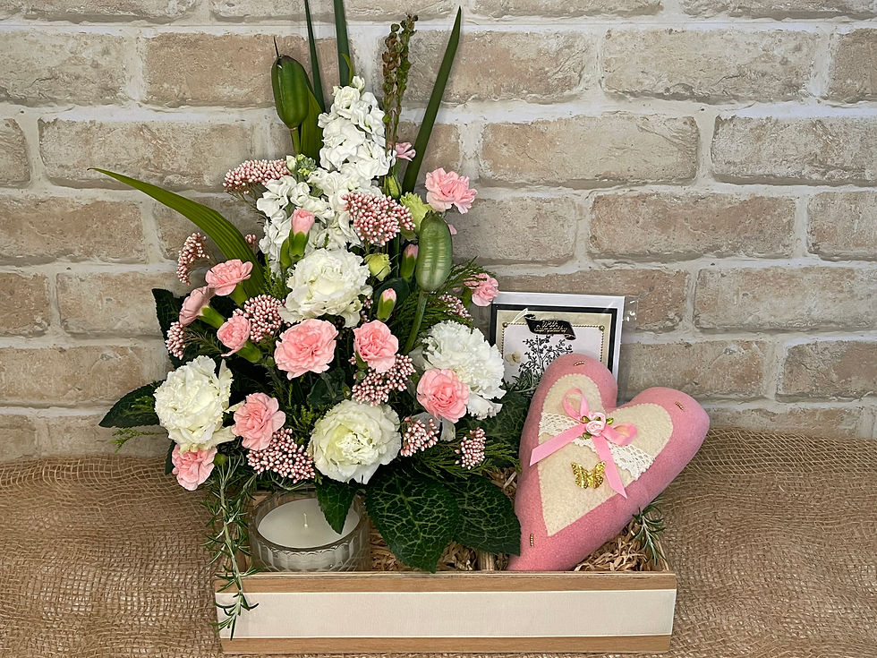 For our gift boxes, each sturdy wooden box features three compartments, perfect for your flower arrangement, custom decorations, and a personal touch. With handmade decorations and the option to include your own personal gift, our creations are truly one-of-a-kind.